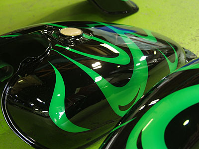 黒に塗装 ⇒ 緑のデザインライン塗装 ⇒ エアブラシで陰影をつける ⇒ 緑のキャンディ塗装 ⇒ クリヤコート と 結構手間が掛かってますが、ホント、この艶感はなんともいえません