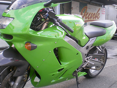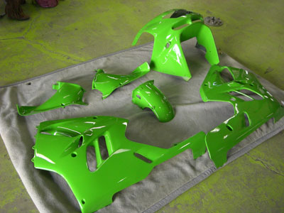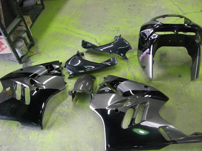ツートンで塗り分けてあったり、ステッカーが貼ってあったりで、サフェーサーを入れてカワサキのあの色に大変身!