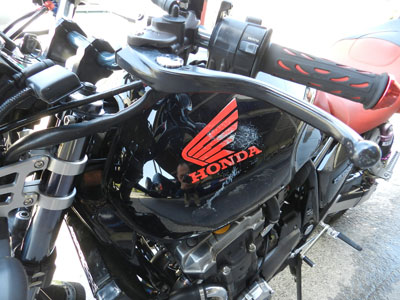 傷の入ったところにFRPを貼っています。結構年数の経って いるバイクなので、、、塗膜が幾重にもなっているのがわかるでしょうか・・・