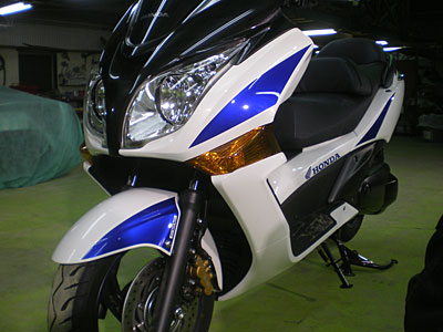 実はこれシルバーウイングなのですが、このバイクのオーナーさんも以前より青に塗装したいとお考えだったそうで、JUNKのHPの青白CBをご覧になって、自分と同じような人がいるんだなぁと思われたとか。