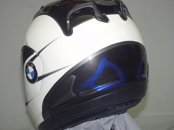 ベースのパールホワイトを活かして、青部分を塗装し、ステッカーを貼りオーバークリヤしました