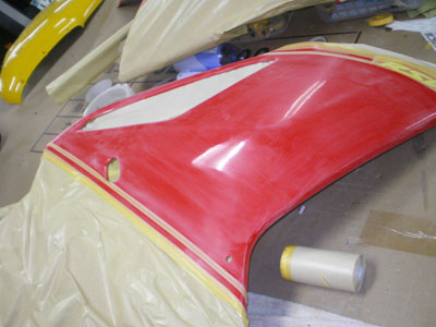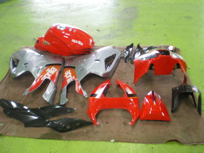 真っ赤に塗られたアプリリアは、デザインラインを入れるために一度車体に仮組みしました。