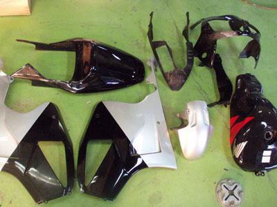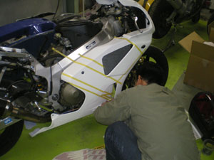 カウルのステッカーははがし終わったところです