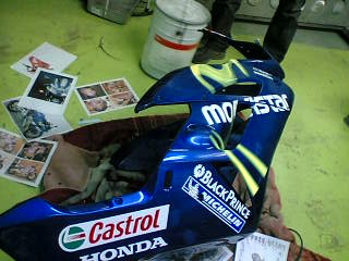 CBR600用のステッカーなのか、カウルの形状が違うので、所々合わないところがありますが、社長と位置決めしながら着実に貼っていきます。