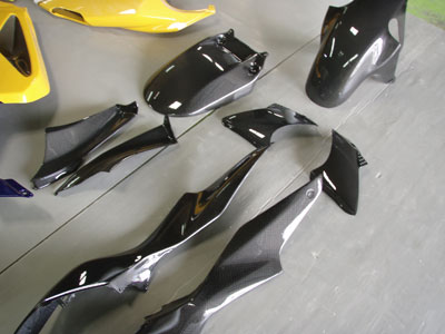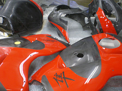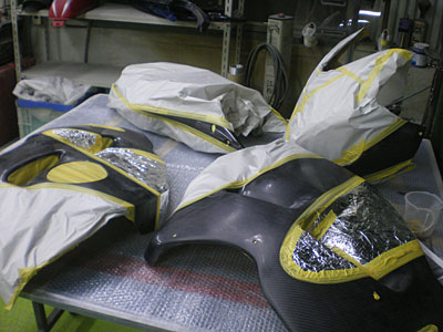 まずはラインを引きます。今回は純正の外装ではなく、カーボンの外装です。タンクもレース用のタンクに変更されています。。