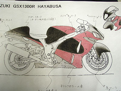 隼の純正のラインを活かしながらシートカウルにもラインを延ばしたり、黒の部分はグラデーションにしたりと、とても凝ったデザインです