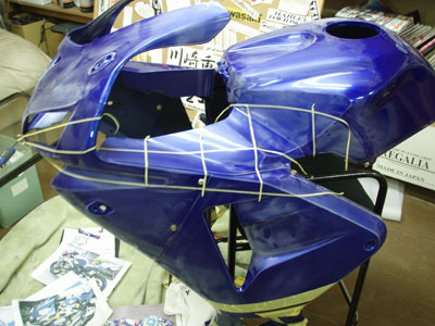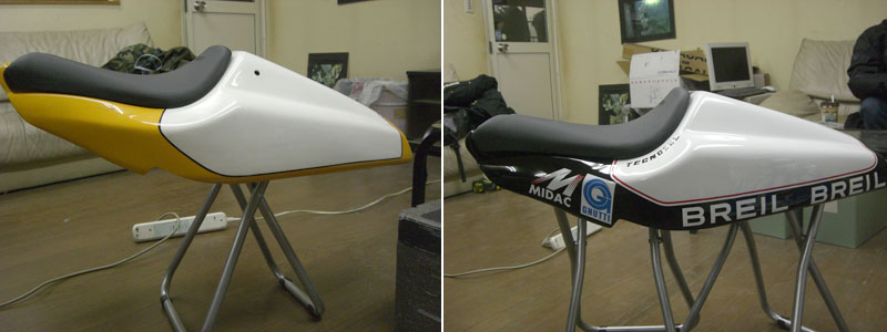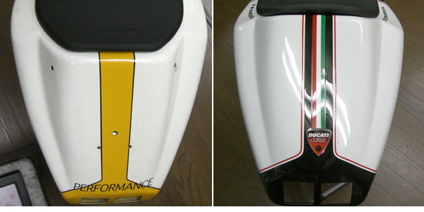 そして、シートカウルは穴埋めをしてトリコロールのライン・ゼッケンのスペースも塗装をしてアンダークリヤ♪左が塗装前、右が塗装後です。