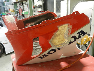 傷の入ったところにFRPを貼っています。結構年数の経って いるバイクなので、、、塗膜が幾重にもなっているのがわかるでしょうか・・・