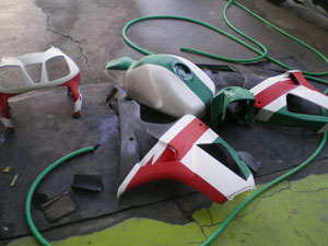 タンクに凹みがあるので、その凹みを直すのと、カウルのステッカーをはがします