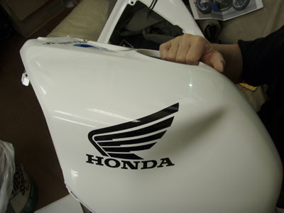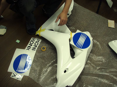 こうやって実際のカウルに合わせてステッカーのサイズを決め、塗り分けのライン等も決めていきます。
